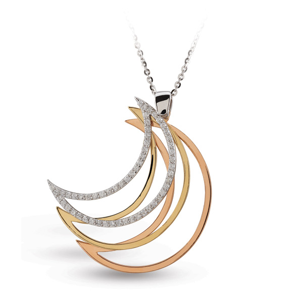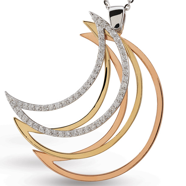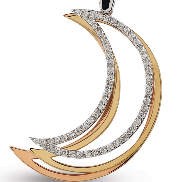 Ay model kolye 14 ayar altın madeninden üretilmiştir. Kolye üzerinde 57 adet 0,32 karat ağırlığında H renk VS/SI berraklığında pırlanta taş mevcuttur. Kolye zinciri 42 cm uzunluğundadır. Kolye 5,89 gram ağırlığındadır.
