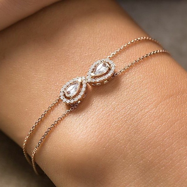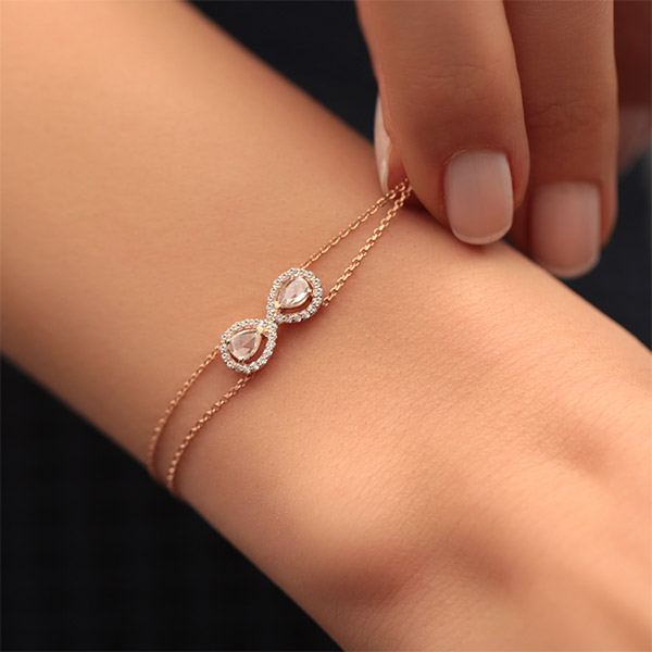 Damla model bileklik 14 ayar altın madeninden üretilmiştir. Bileklik üzerinde 2 adet 0,28 karat ve 36 adet 0,20 karat ağırlığında H renk VS renginde beyaz pırlanta taş mevcuttur. Bileklik 3,04 gram ağırlığındadır.