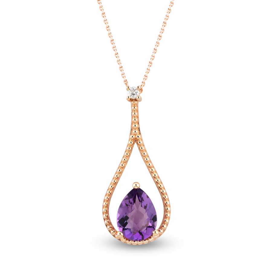 Damla model kolye 14 ayar altın madeninden üretilmiştir. Kolye üzerinde 1 adet 0,03 karat ağırlığında H renk VS/SI berraklığında pırlanta taş ve 1 adet 1 karat ağırlığında ametist taş mevcuttur. Kolye zinciri 42 cm uzunluğundadır. Kolye 4 gram ağırlığındadır.
