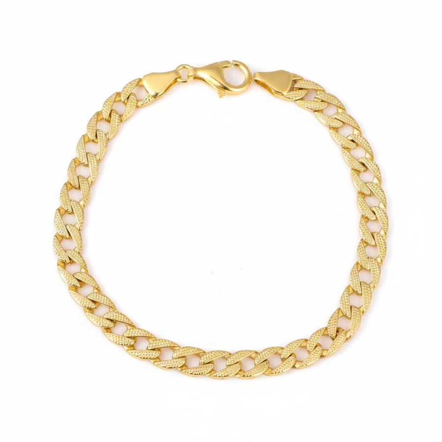 14 ayar altındır. Gurme zincir model bileklik 19 cm uzunluğundadır. Bileklik 0,6 mm'ye 0,8 mm boyutlarındaki desenli halkalardan oluşur. Gümüş bileklik 12,16 gram ağırlığındadır.