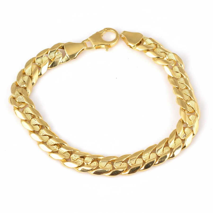 14 ayar altındır. Gurme zincir model bileklik 20 cm uzunluğundadır. Bileklik 0,9 mm'ye 12 mm boyutlarındaki desenli halkalardan oluşur. Altın bileklik 37,56 gram ağırlığındadır.