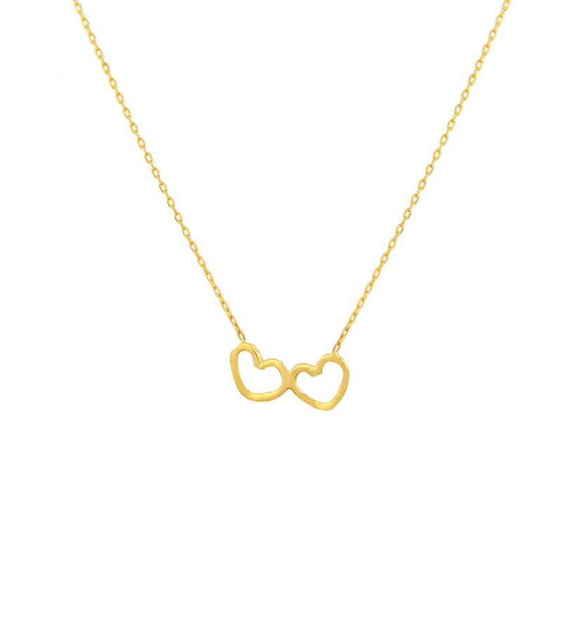 14 ayar altındır. çift kalp kolye 1,5 cm'ye 0,5 cm boyutlarındadır. Zincir 45 cm uzunluğundadır. Kolye taşsızdır. Ağırlığı 2,14 gramdır.