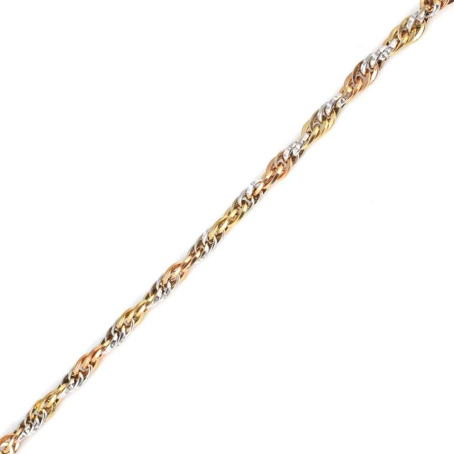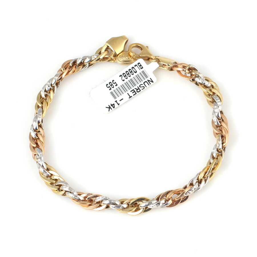 Bileklik 14 ayar altından imal edilmiştir. Örgü model bileklik 19 cm uzunluğundadır. Bileklik 0,5 cm enindedir. Altın bileklik yeşil, kırmızı ve beyaz renklidir. Bileklik taşsızdır. Ağırlığı 7,4 gramdır.