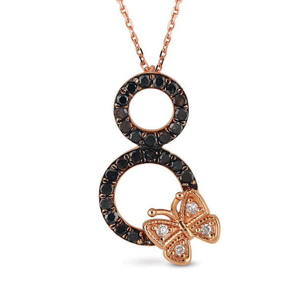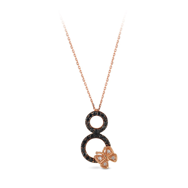 Kelebek model kolye 14 ayar altın madeninden üretilmiştir. Kolye üzerinde 4 adet 0,02 karat ağırlığında H renk VS/SI berraklığında pırlanta taş ve 12 adet 0,13 karat ağırlığında siyah pırlanta mevcuttur. Kolye zinciri 42 cm uzunluğundadır. Kolye 2,99 gram ağırlığındadır.