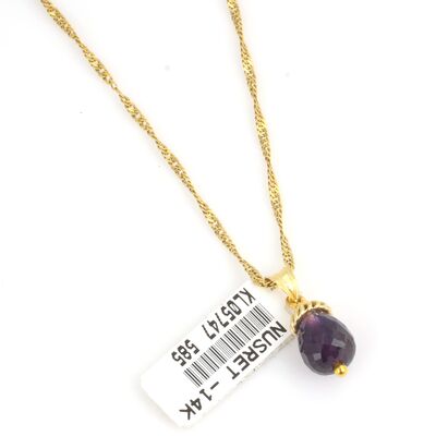 Kolye ucu 14 ayar altından imal edilmiştir. Taşlı model kolye ucu 2,2 cm'ye 0,8 cm boyutlarındadır. Ametist taşından oluşan küçük sade bir kolye ucudur. Zincir dahil değildir. Kolye ucu ametist taşlıdır. Kolye ucu 1,53 gram ağırlığındadır.