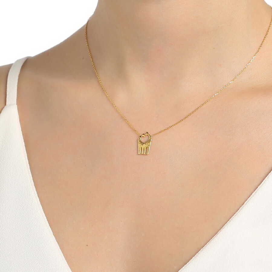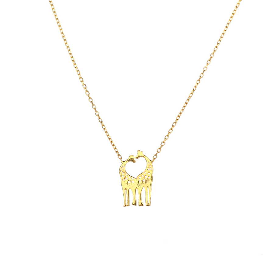 14 ayar altındır. Aşık zürafa kolye 1,5 cm'ye 1,0 cm boyutlarındadır. Zincir 45 cm uzunluğundadır. Kolye taşsızdır. Ağırlığı 2,36 gramdır.