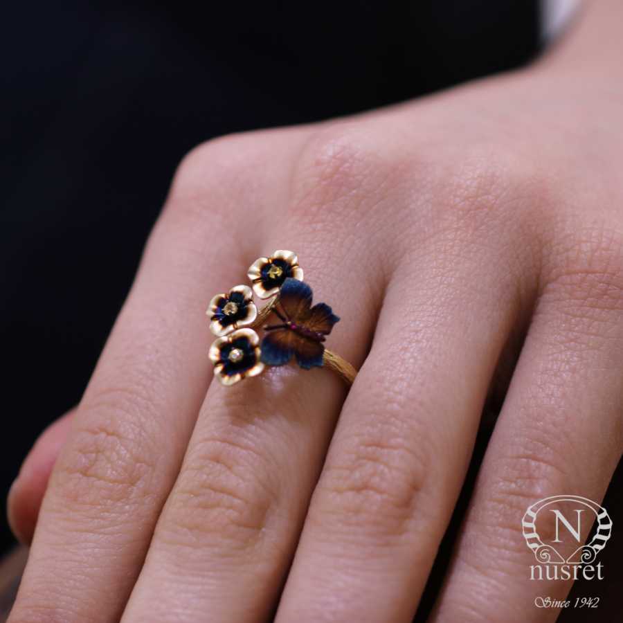 14 ayar altındır. Kelebek şeklinde yüzük ölçüsü istediğiniz boy yapılmaktadır. Kelebeğin çevresinde çiçekler vardır. Gramı: 4,67 gr Parmak ölçüsüne göre üründe gramaj (artı-eksi) oynayabilmektedir. (-)gram çıkması durumunda müşteri tarafına iade yapılmaktadır, (+)gram çıktığında ilave tutar müşteriden tahsil edilir.