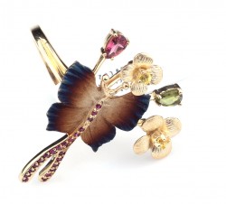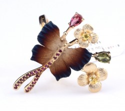 14 ayar altındır. Kelebek şeklinde yüzük ölçüsü istediğiniz boy yapılmaktadır. Pembe ve yeşil zirkon taşlar kullanılmıştır. Kelebeğin çevresinde çiçekler vardır.
