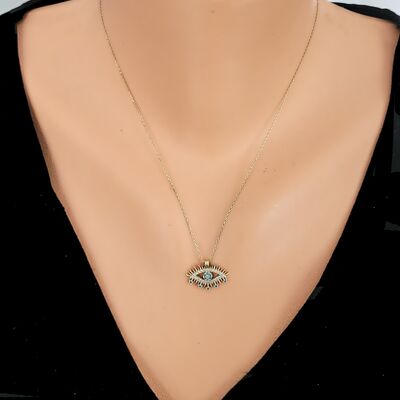 Gelince Haber Ver Altın kolye 14 ayar altından üretilmiştir. Göz model kolye 42 cm uzunluğundadır. Kolye 1,8 cm'ye 1,0 cm boyutlarındadır. Kolye akuamarin renk ve zirkon taşlıdır. Ağırlığı 2,14 gramdır. Verilen gramlar yaklaşıktır, değişebilir.