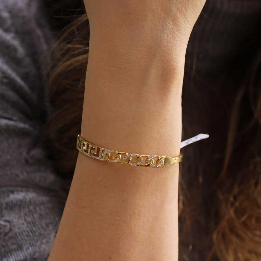 Bilezik 14 ayar altından imal edilmiştir. Grekli Gurmet model bileklik 6,2 cm çapındadır. Bileklik 0,7 cm kalınlığındadır. Bileklik zirkon taşlıdır. Ağırlığı 7,15 gramdır.