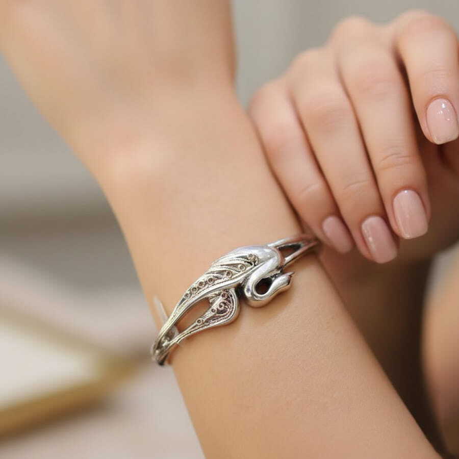 925 ayar gümüş ve 14 ayar altının bir arada kullanılmasıyla hazırlanan bilekliktir. Kuğu model bileklik 6,2 cm çapında ve 2 cm kalınlığındadır. Bileklik taşsızdır. Altın ve Gümüş bileklik 0,84 gramdır.