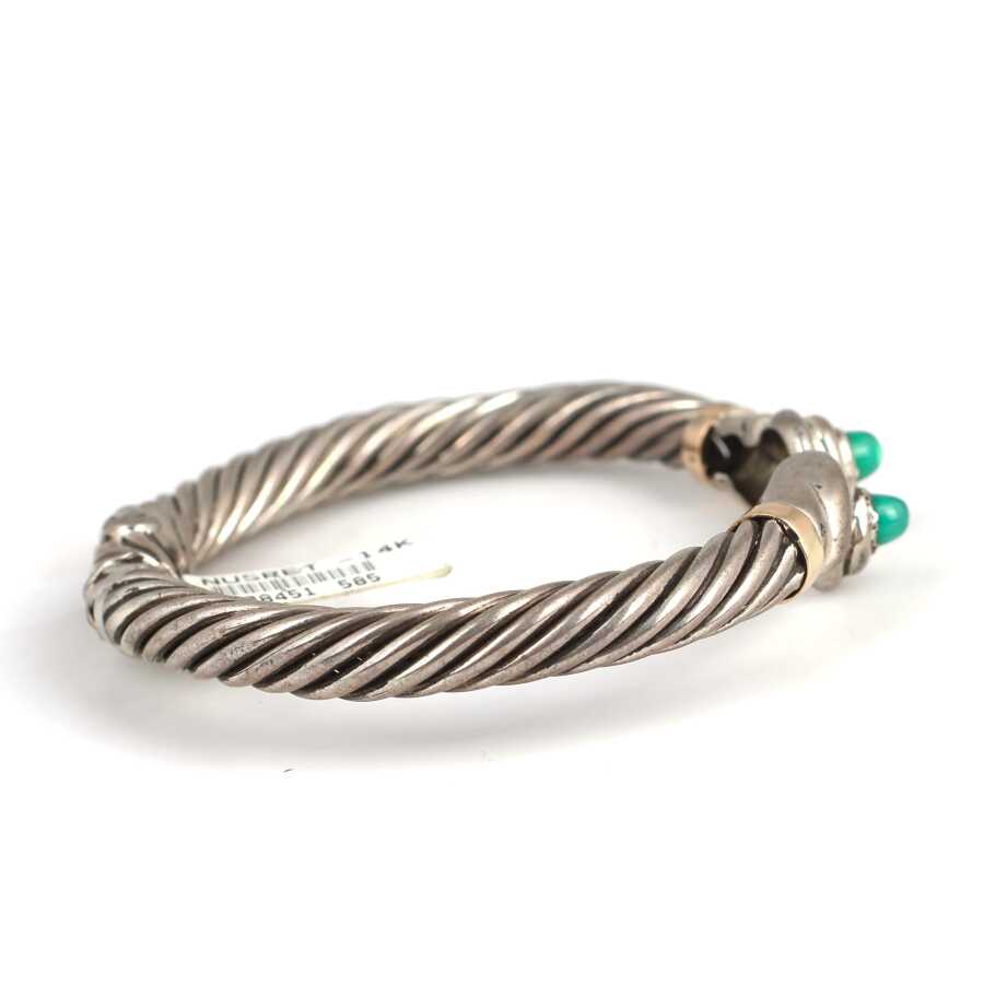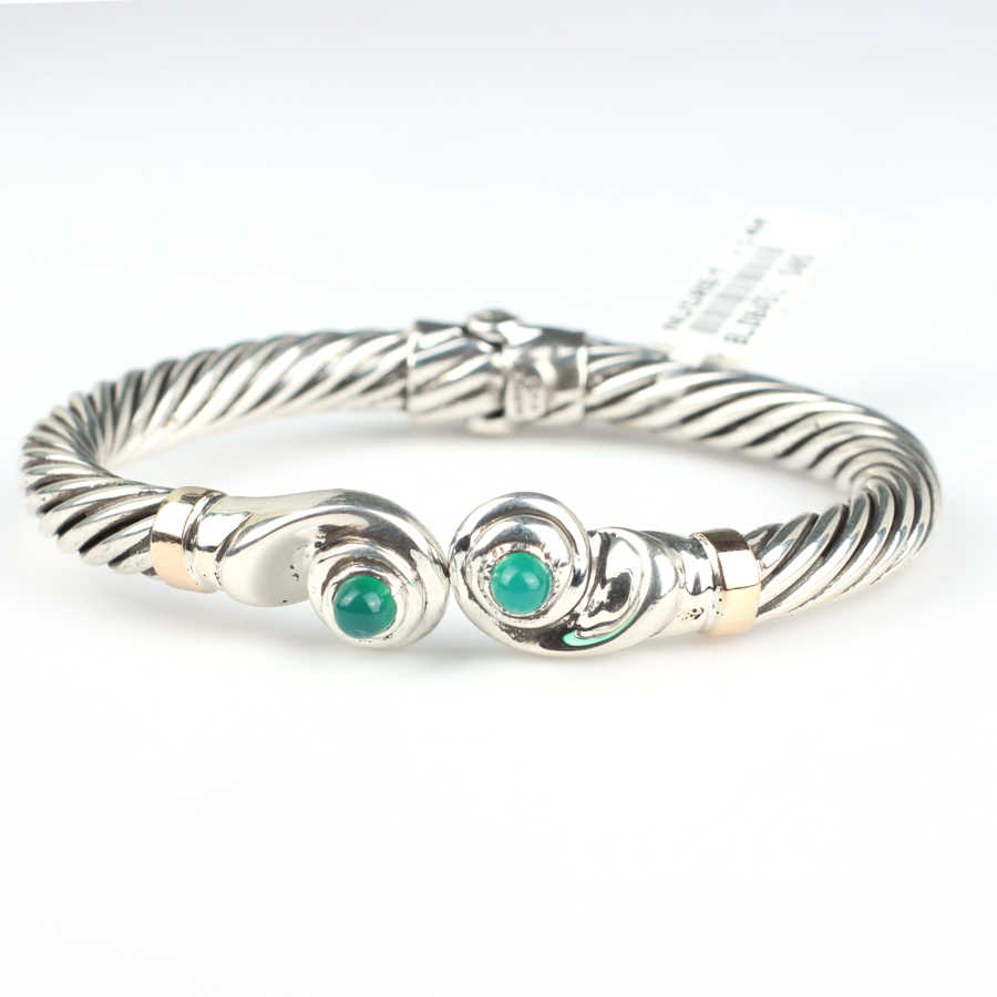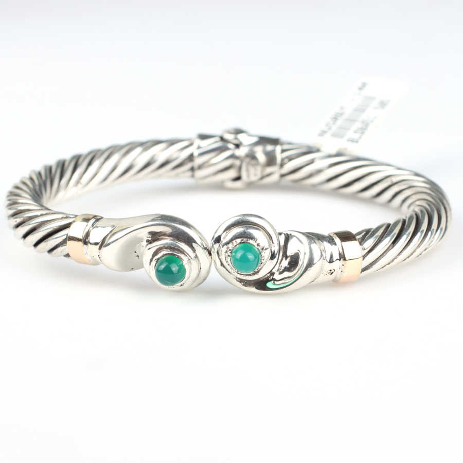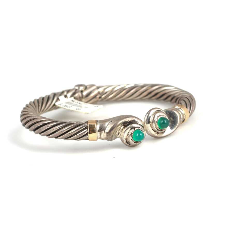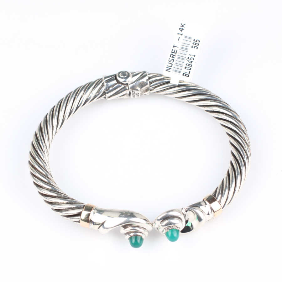 14 Ayar Altın & Gümüş Yeşim Taşlı Solucan Desenli Burma Bilezik