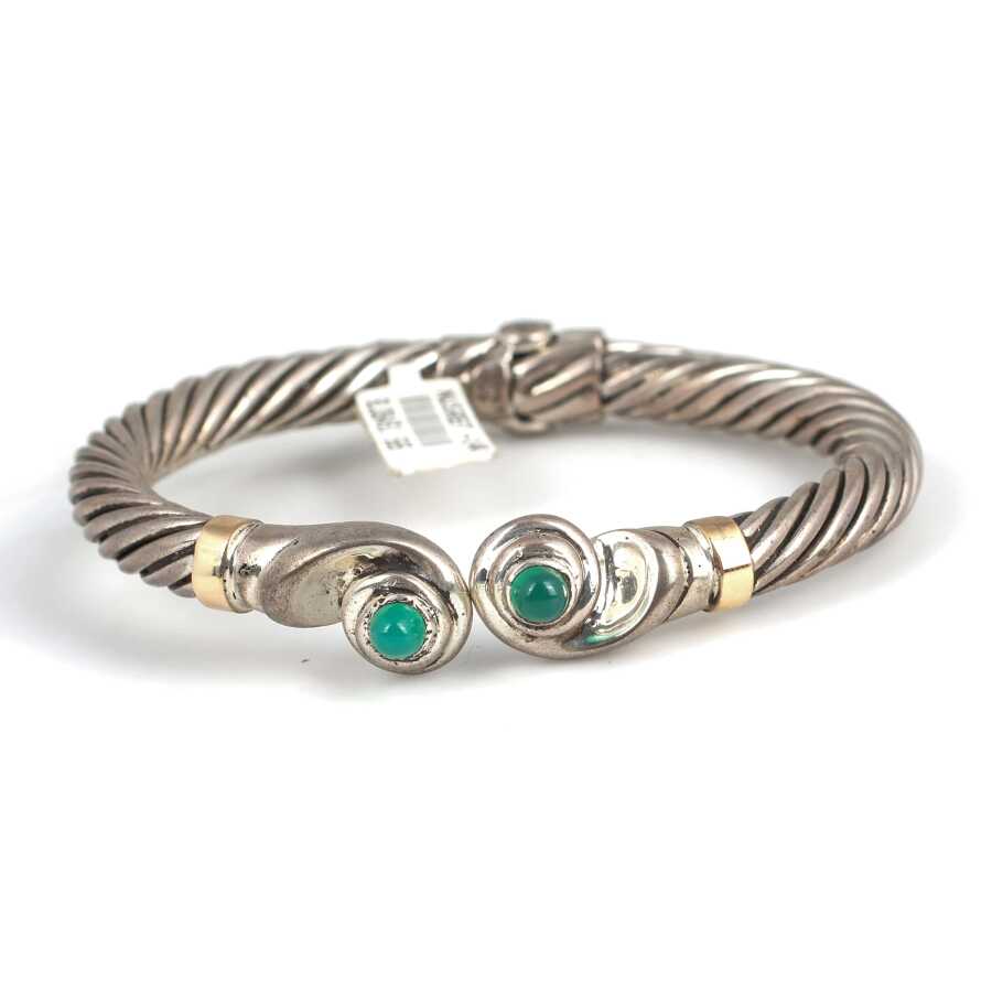 14 ayar altın ve 925 ayar gümüş bilezik çapı: 6,5 x 0,9 cm`dir. Yeşim taşlıdır. Yaylı kilitlidir. Gramı 0,63 gr
