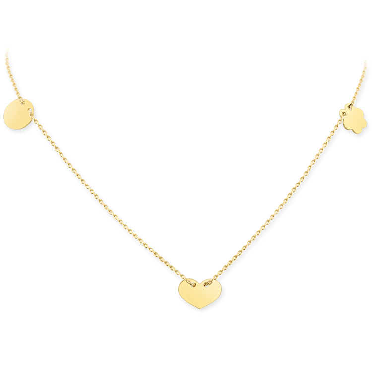 Altın kolye 14 ayar altından üretilmiştir. Plaka şeklinde kalp, yonca ve yuvarlak model Kolye 42 cm uzunluğundadır. Kolye taşsızdır. Ağırlığı 4,16 gramdır. Verilen gramlar yaklaşıktır, değişebilir.