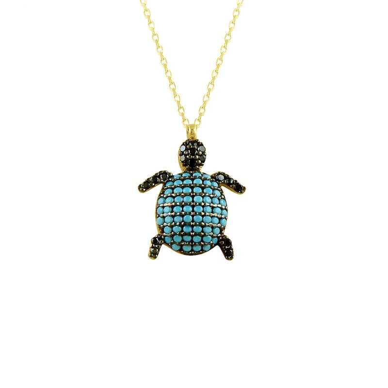 Altın kolye 14 ayar altından üretilmiştir. Kaplumbağa model Kolye 45 cm uzunluğundadır. Kolye zirkon ve turkuaz taşlıdır. Ağırlığı 3,55 gramdır. Verilen gramlar yaklaşıktır, değişebilir.