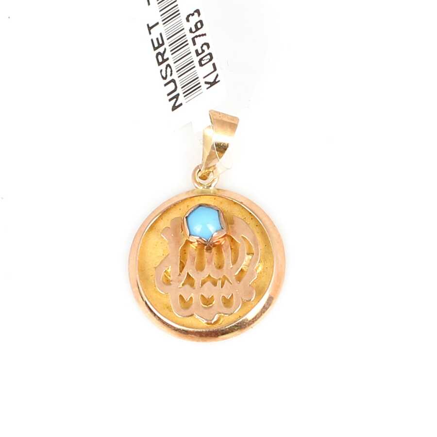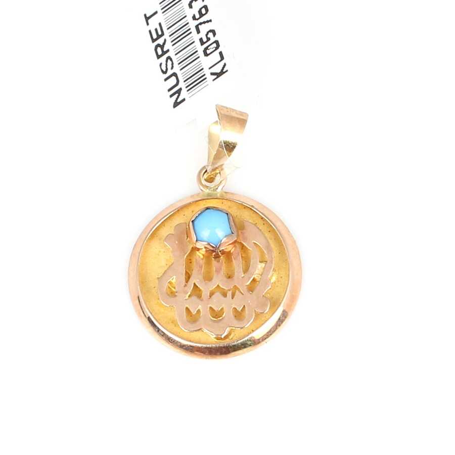 Kolye ucu 14 ayar altından imal edilmiştir. Maşallah yazılı model kolye ucu 2,5 cm'ye 1,7 cm boyutlarındadır. Zincir dahil değildir. Kolye ucu turkuaz taşlıdır. Kolye ucu 1,45 gram ağırlığındadır.