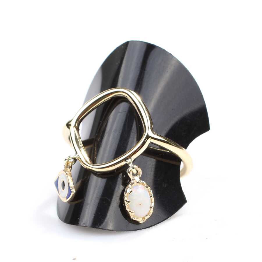 14 Ayar altındır. Yüzüğün ortasındaki karo parçada sallanan opal taş ve göz modeli parçalarından oluşur. Yüzük ölçüsü 16 no dur. İstenilen ölçü yapılır. Gramı: 2,09 gr