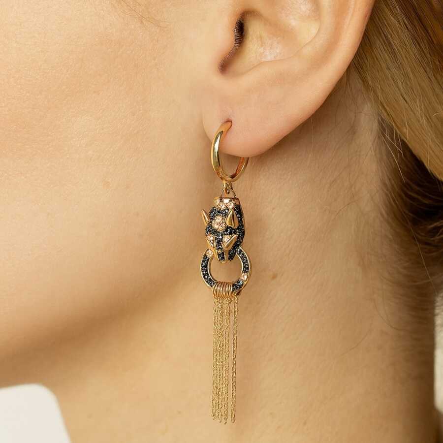 Altın küpe 14 ayar altından üretilmiştir. Panter kafası model küpe 7 cm boyutlarındadır. Küpe zirkon taşlıdır. Ağırlığı 10,98 gramdır. Verilen gramlar yaklaşıktır, değişebilir.