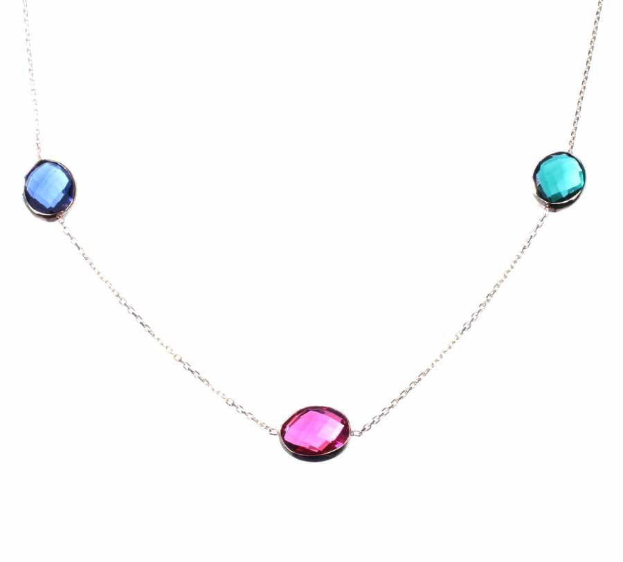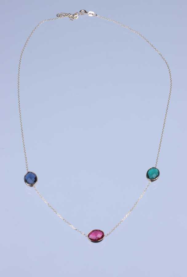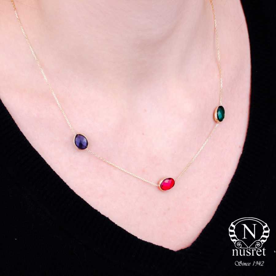 Altın kolye 14 ayar altından üretilmiştir. Taşlı zarif model kolye 45 cm uzunluğundadır. Kolye yakut, zümrüt ve safir renk taşlıdır. Taşlar isteğinize göre değiştirilebilir. Ağırlığı 3,35 gramdır. Verilen gramlar yaklaşıktır, değişebilir.