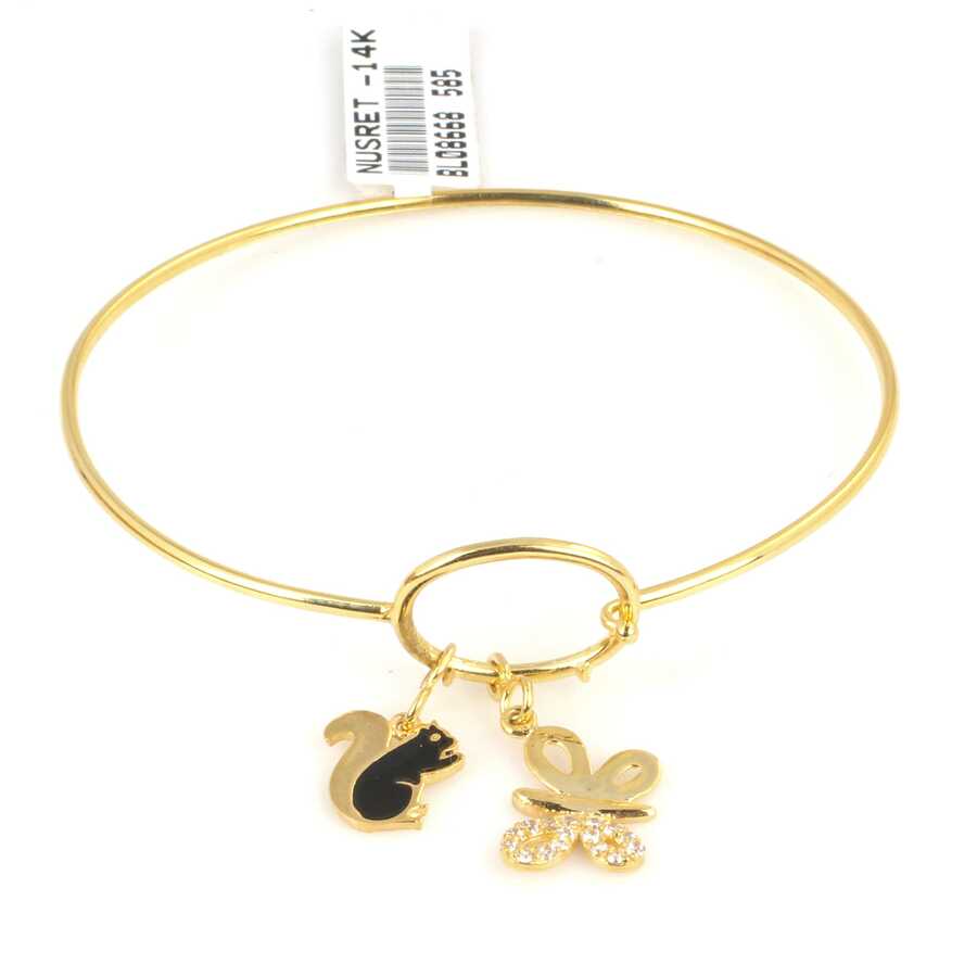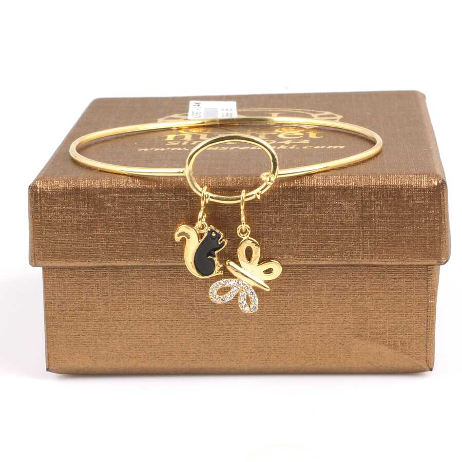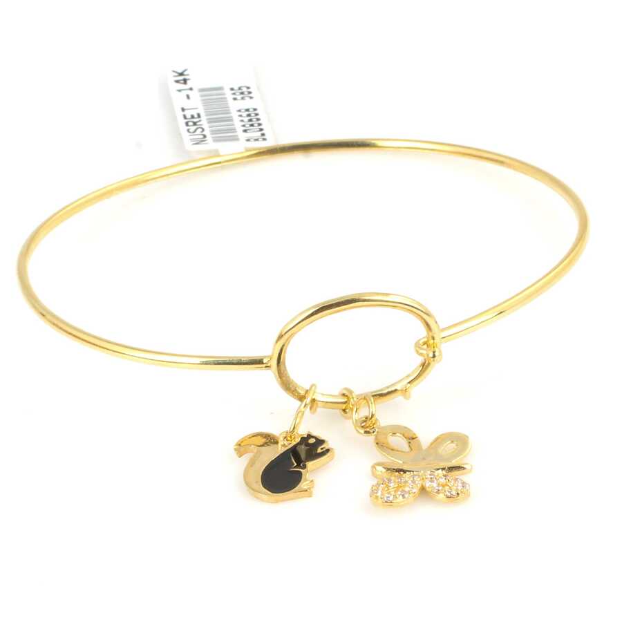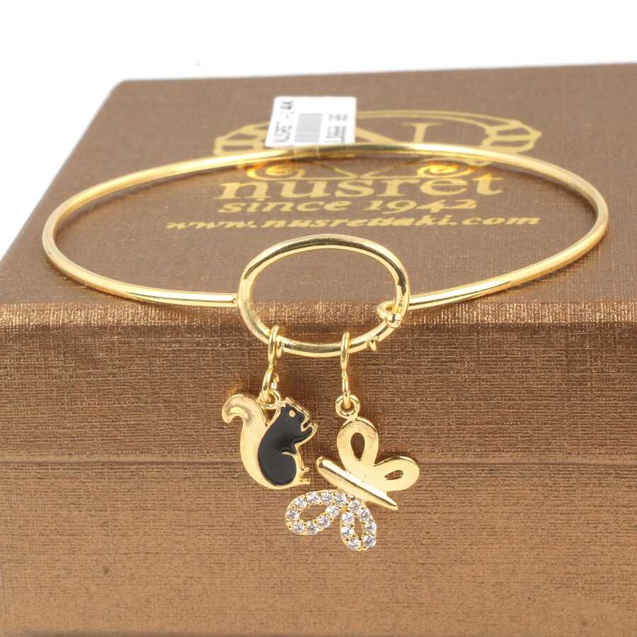 Bilezik 14 ayar altından imal edilmiştir. Sincap ve kelebek model tel bilezik 6 cm çapındadır. Bilezik zirkon taşlıdır. Bilezik 4,52 gram ağırlığındadır.