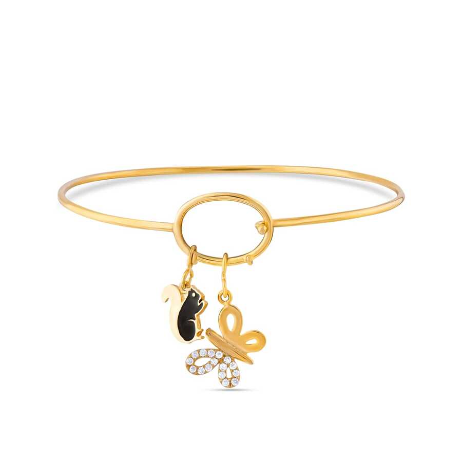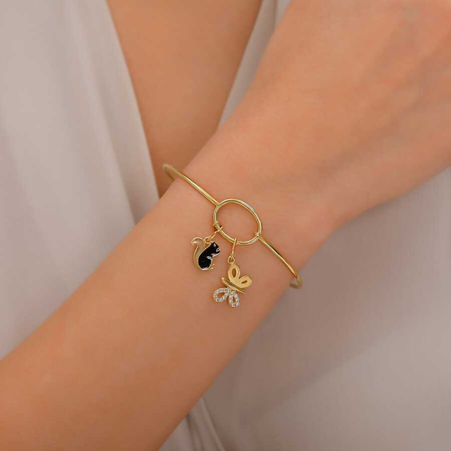 14 Ayar Altın Sallantılı Sincap ve Taşlı Kelebek Kelepçe Bilezik