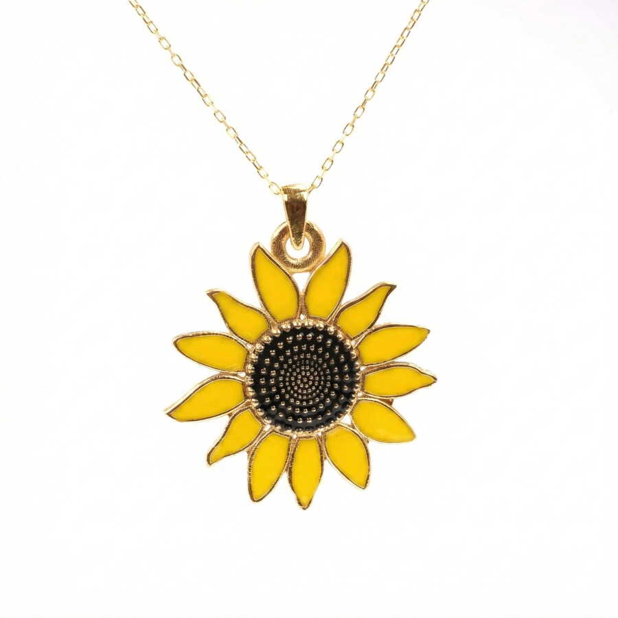 14 ayar altındır. 45 cm uzunluğundadır. Ayçiçek kolye 2,9 cm'ye 3,2 cm boyutlarındadır. Kolye sarı mineli ve taşsızdır. Ağırlığı 9,17 gramdır.