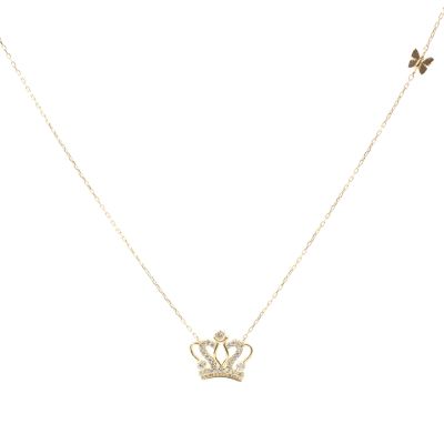 Altın kolye 14 ayar altından üretilmiştir. Taç model kolye 42 cm uzunluğundadır. Taç 1,7 cm'ye 1,4 cm boyutlarındadır. Zincir üzerinde bulunan kelebek ise 0,6 cm'ye 0,5 cm boyutlarındadır. Kolye zirkon taşlıdır. Ağırlığı 2,88 gramdır. Verilen gramlar yaklaşıktır, değişebilir.
