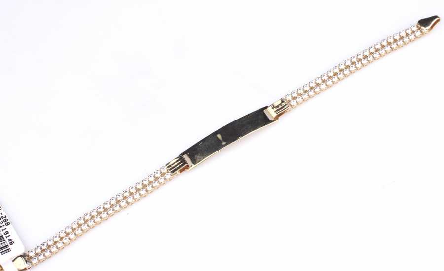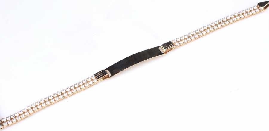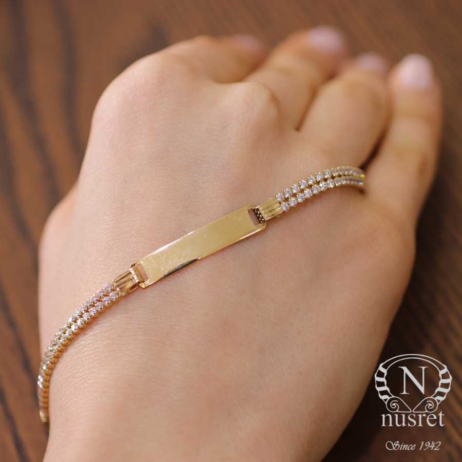 Bileklik 14 ayar altından imal edilmiştir. Çocuk künye model bileklik 14 cm uzunluğundadır. Bileklik zirkon taşlıdır. Çift sıra suyolu model bilekliktir. Bileklik üzerine istediğiniz ismi yazdırabilirsiniz. Ürün Kişiye özeldir. İadesi mümkün değildir. Altın bileklik 4,59 gram ağırlığındadır.