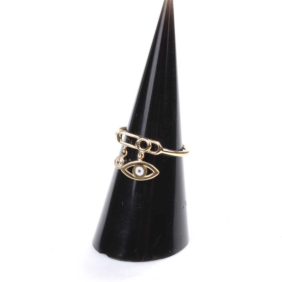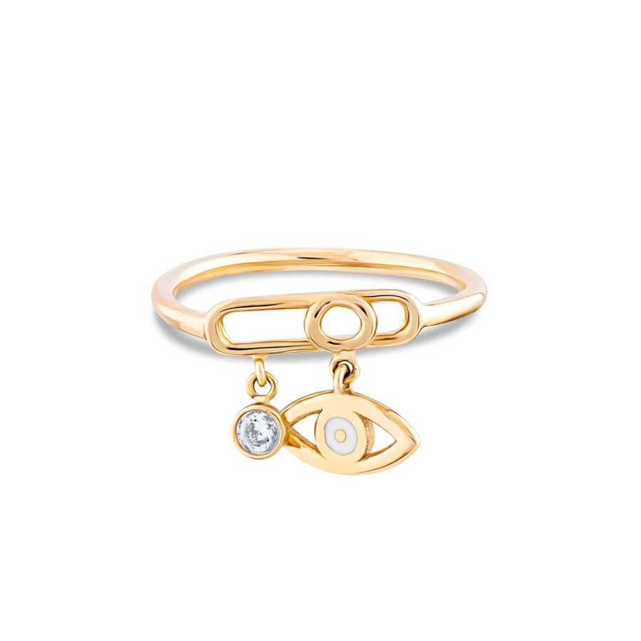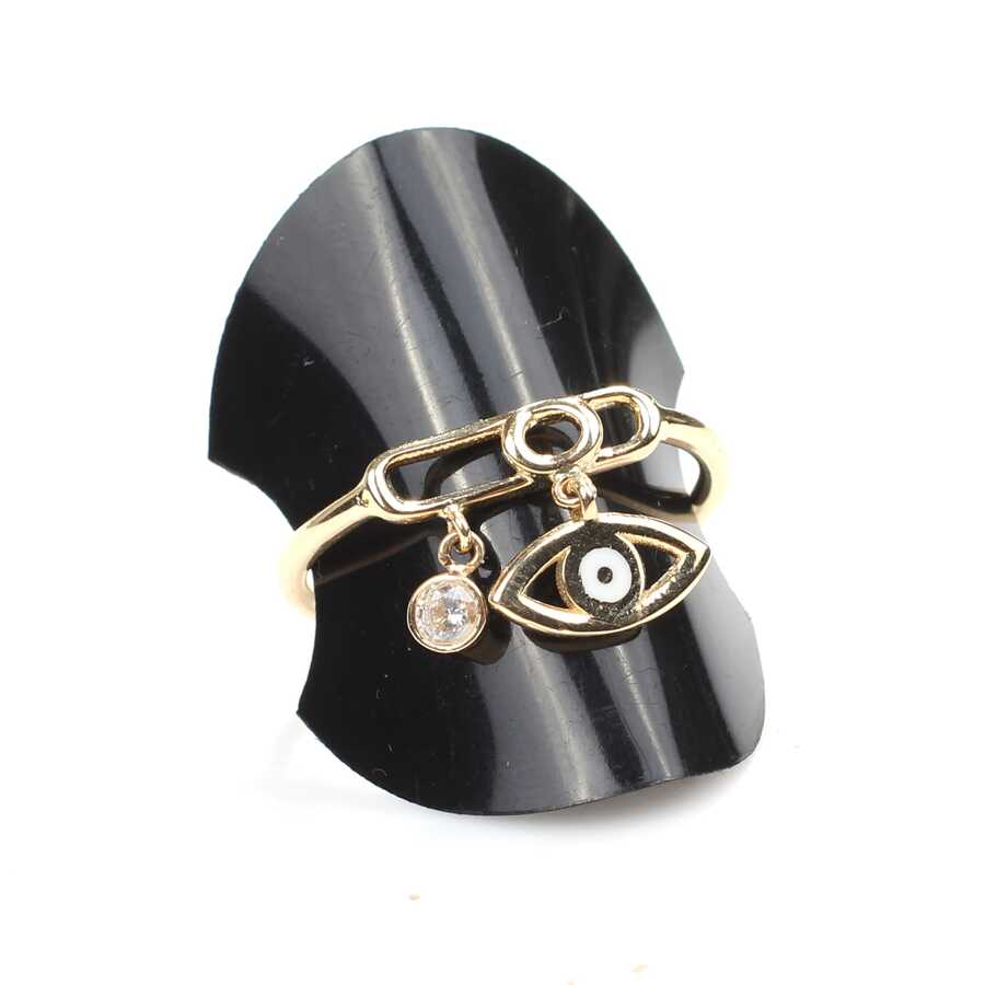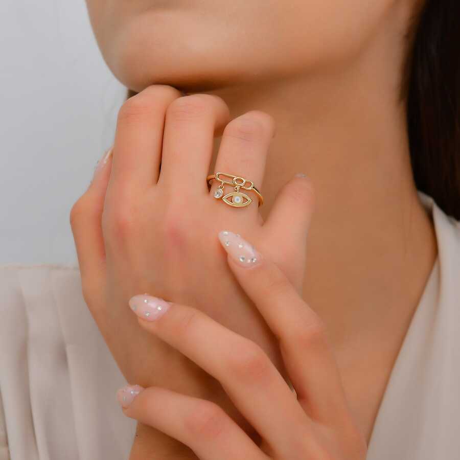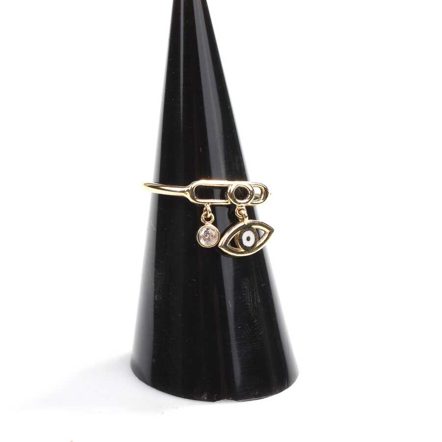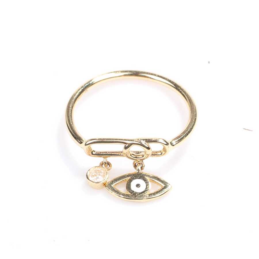 14 Ayar altındır. Yüzüğün ortasındaki sallanan minik tektaş ve göz modeli parçalarından oluşur. Yüzük ölçüsü 17 no dur. İstenilen ölçü yapılır. Gramı: 2,6 gr