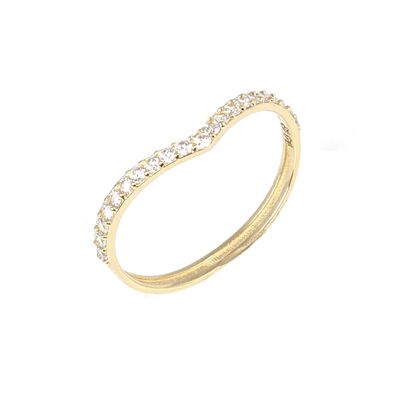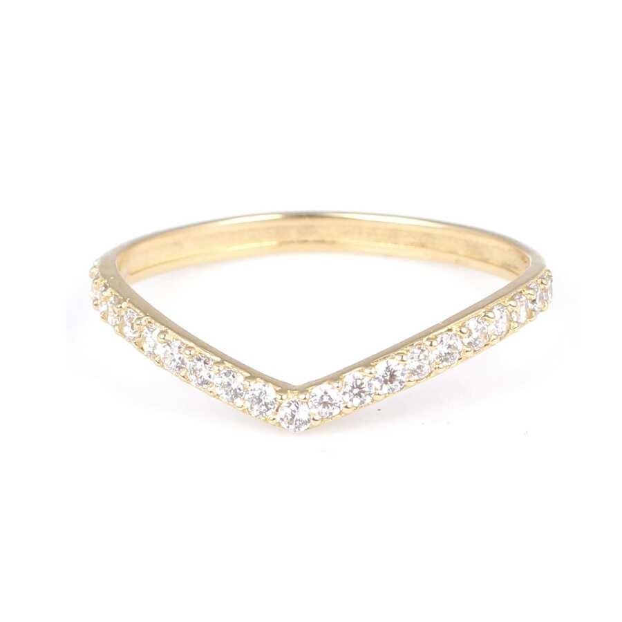 Yüzük 14 ayar altından üretilmiştir. V şeklinde yüzük 10 ölçüdür. Tüm ölçüler yapılabilmektedir. Yüzük beyaz zirkon taşlıdır. Ağırlığı 1,1 gramdır.