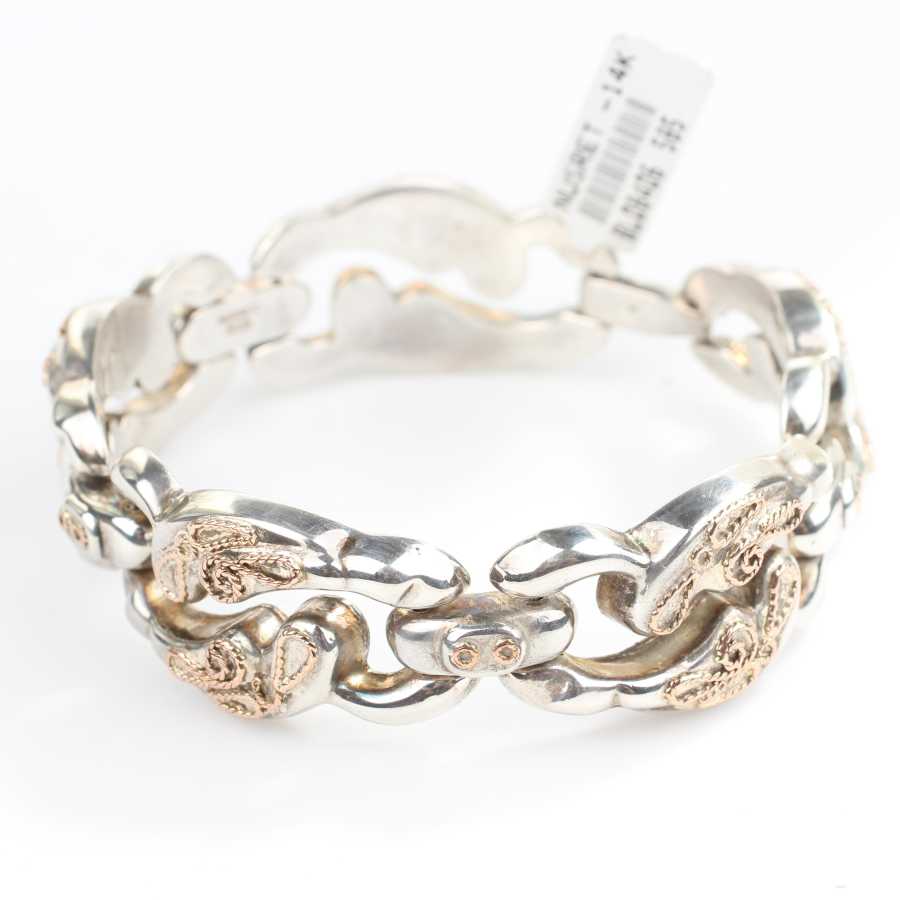 14 ayar altın ve 925 ayar gümüş bileklik boyu: 19,5 x 2 cm 'dir. Üzerindeki işlemeler telkâridir Gramı: 2,85 gr