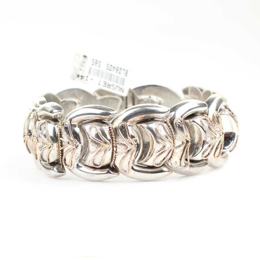 14 ayar altın ve 925 ayar gümüş bileklik boyu: 19,5 x 2,4 cm'dir. Üzerine telkari işleme ile motifler yapılmıştır. Gramı: 5,7 gr