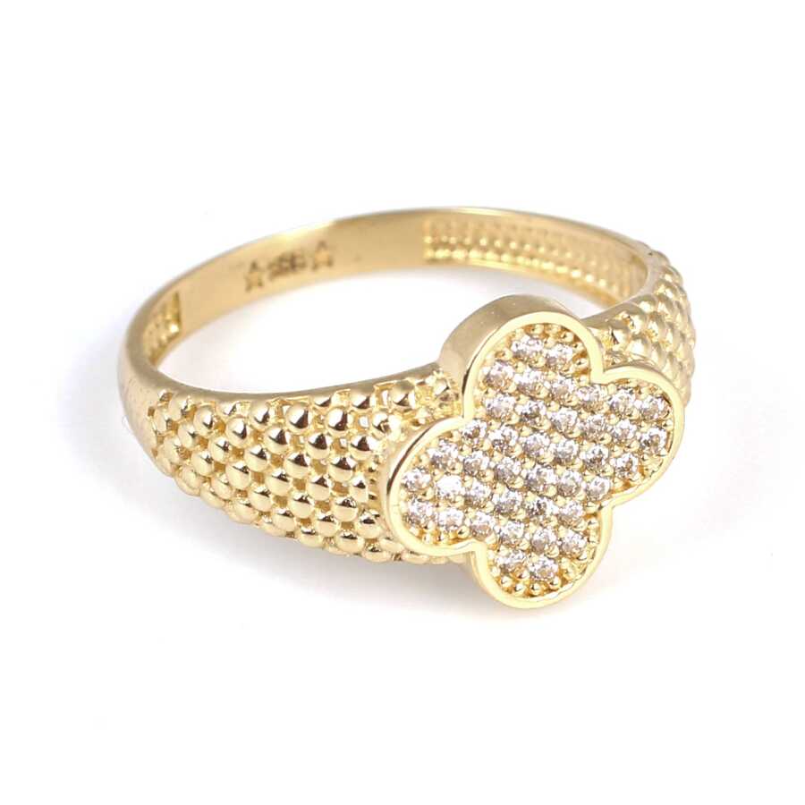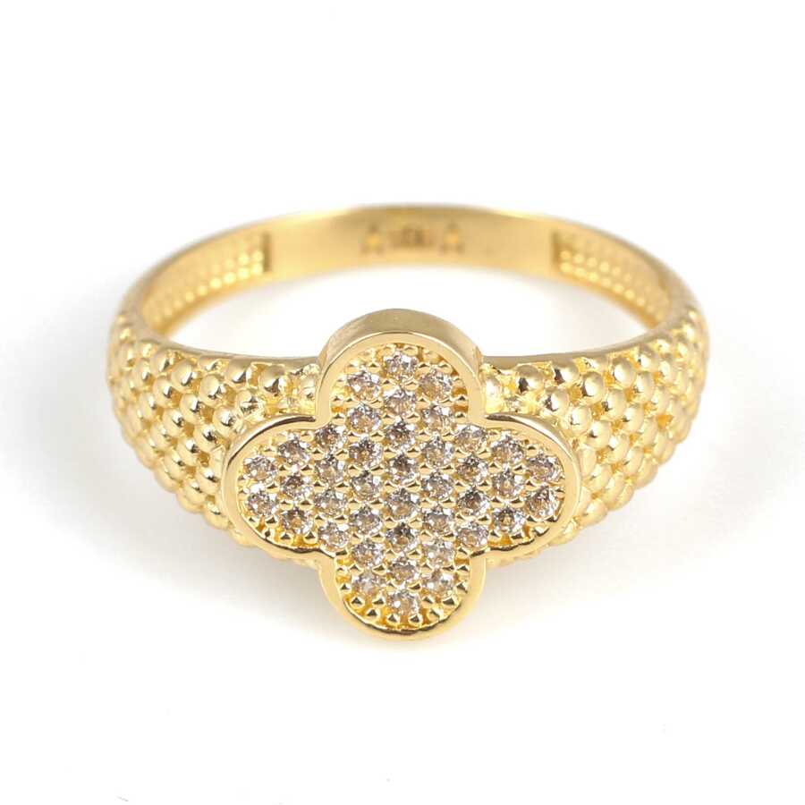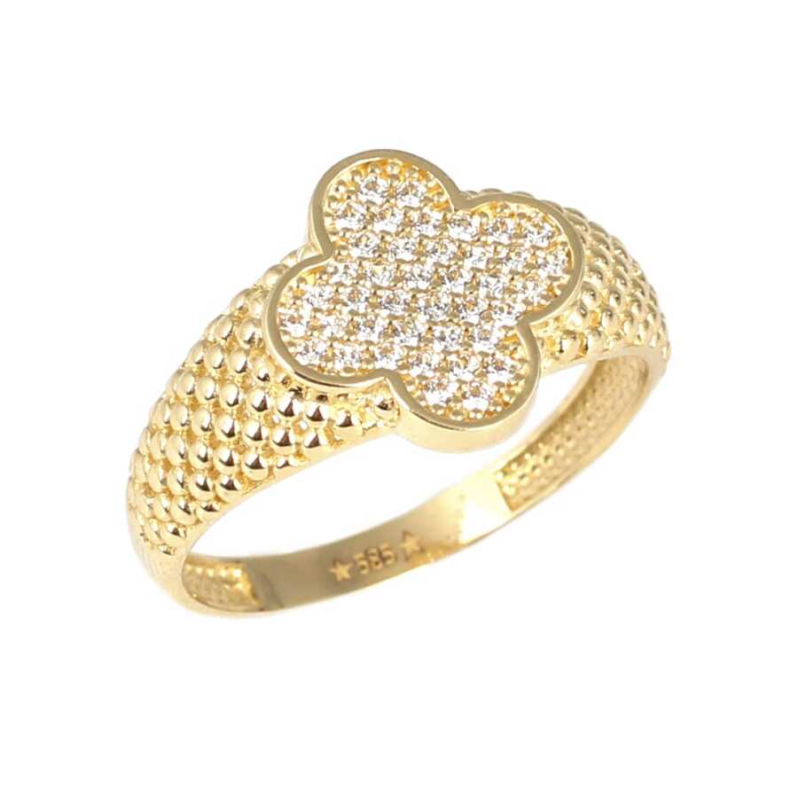 Gelince Haber Ver Yüzük 14 ayar altından üretilmiştir. Yüzüğün üst kısmı 1,2 cm boyutlarındadır. Yüzük üzerinde yonca şekli vardır. Yüzük zirkon taşlıdır. Resimdeki yüzük 20,5 ölçüdür, ancak tüm ölçüler özel olarak yapılabilmektedir.,Ağırlığı 3,36 gramdır. Verilen gramlar yaklaşıktır, değişebilir.