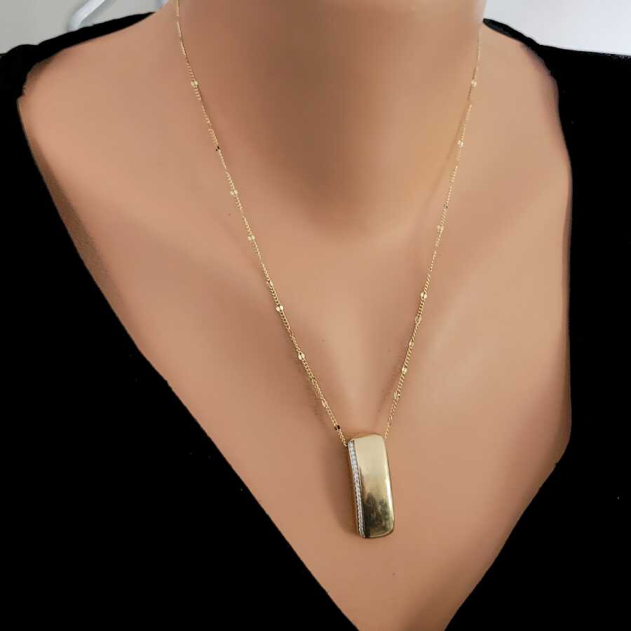 Kolye 14 ayar altından imal edilmiştir. Dikdörtgen kolye 43 cm uzunluğundadır. Kolyenin 3,0 cm'ye 1,2 cm boyutlarındadır. Kolye zirkon taşlıdır. Ağırlığı 6,69 gramdır.