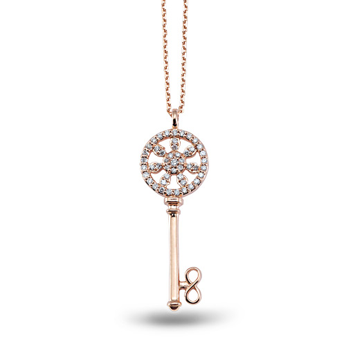 Anahtar model kolye 14 ayar altın madeninden üretilmiştir. Kolye üzerinde 47 adet 0,24 karat ve 1 adet 0,01 karat ağırlığında H renk VS/SI berraklığında pırlanta taş mevcuttur. Kolye zinciri 42 cm uzunluğundadır. Kolye 4,39 gram ağırlığındadır.