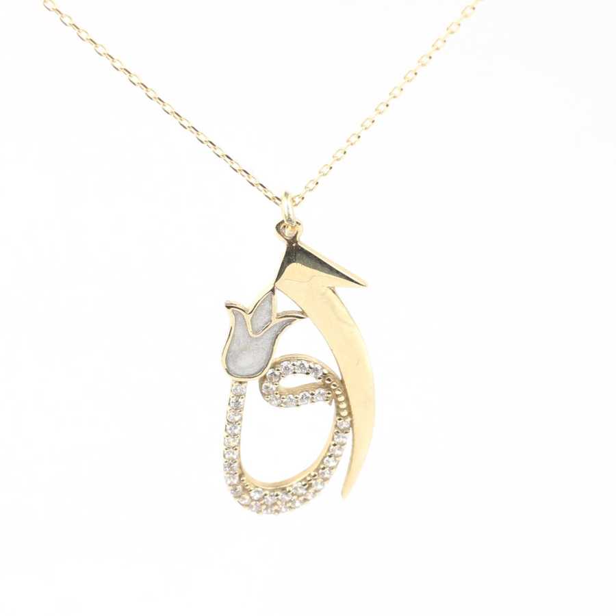 The gold necklace is made of 14-karat gold. The Elif and Vav letter model necklace is 42 cm long. The necklace is set with zircon stones. It weighs 2.51 grams. The weights given are approximate and may vary.