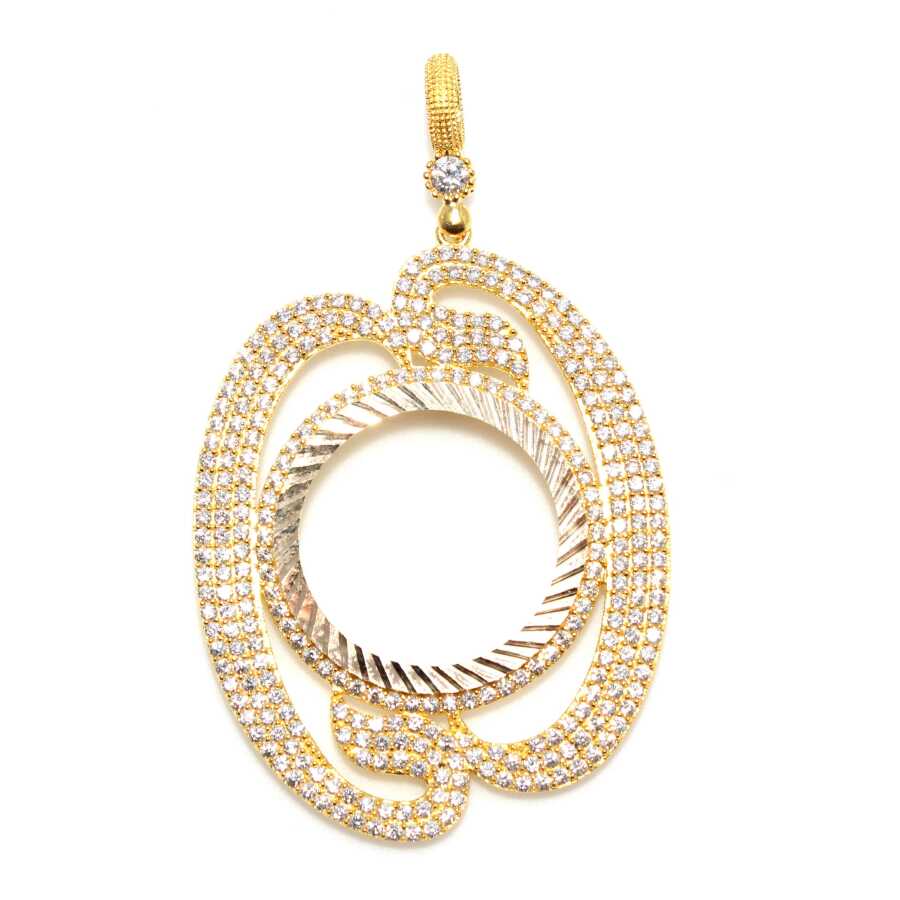 The pendant is made of 14-karat gold. The Ata, Reşat, or half gold frame model pendant measures 6.1 cm by 3.8 cm. You can insert your quarter, half, full, Ata lira, or Reşat gold coin yourself using the prongs inside the frame. Chain not included. The frame is set with zircon stones. The pendant weighs 7.2 grams.