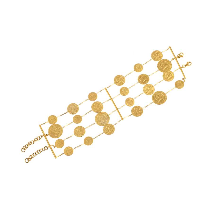 Bileklik 22 ayar altından imal edilmiştir. 4 sıra paralı model bileklik 21 cm uzunluğundadır. Küçüklü büyüklü 24 adet altın paralardan oluşmaktadır. Bileklik taşsızdır. El işi bileklik 46,54 gram ağırlığındadır.