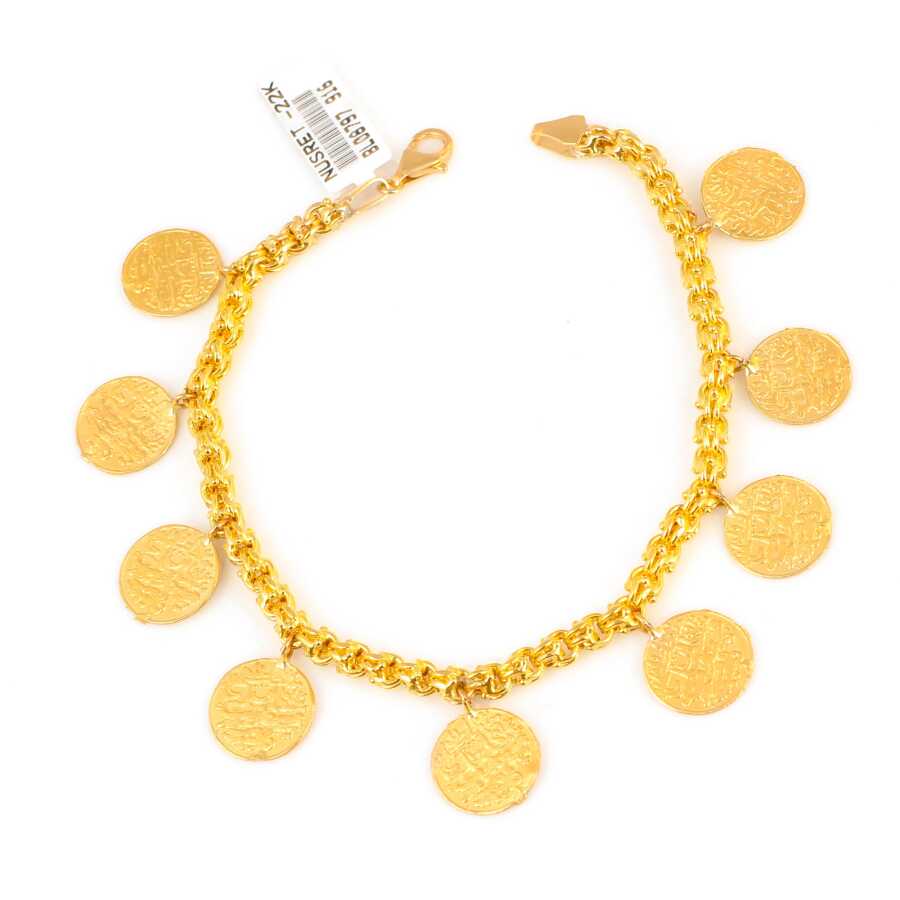 22 Ayar altındır. 21 cm boyunda 9 sikkeli Osmanlı paralı bileklik Arnavut zinciri kullanılarak imal edilmiştir. Gramı: 24,35 gr