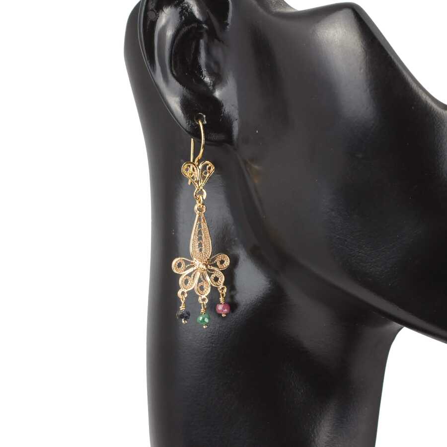 Altın küpe 22 ayar altından üretilmiştir. Çiçek şeklindeki telkari küpe 1.8 cm eninde ve 5.5 cm boyutlarındadır. Telkari küpe zümrüt, yakut ve safir taşlıdır. Altın küpe 8,66 gramdır.