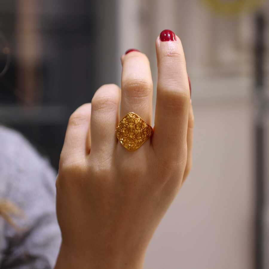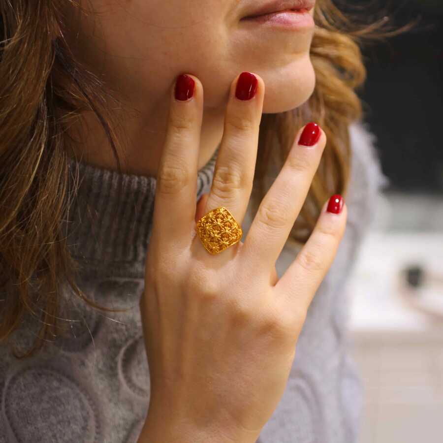Yüzük 22 ayar altından üretilmiştir. Çiçek motifli yüzük 20 ölçüdür. Tüm ölçüler yapılabilmektedir. Yüzüğün üst kısmı 2,2 cm boyutlarındadır. Yüzük taşsızdır. Ağırlığı 7,04 gramdır.