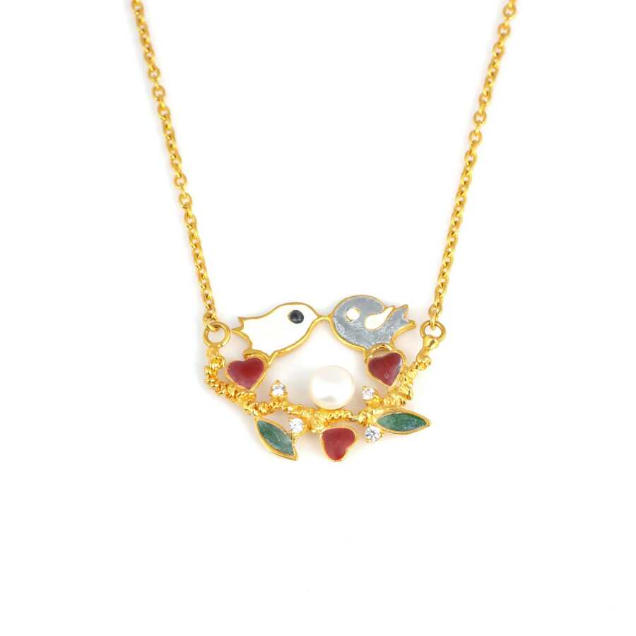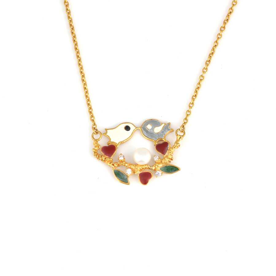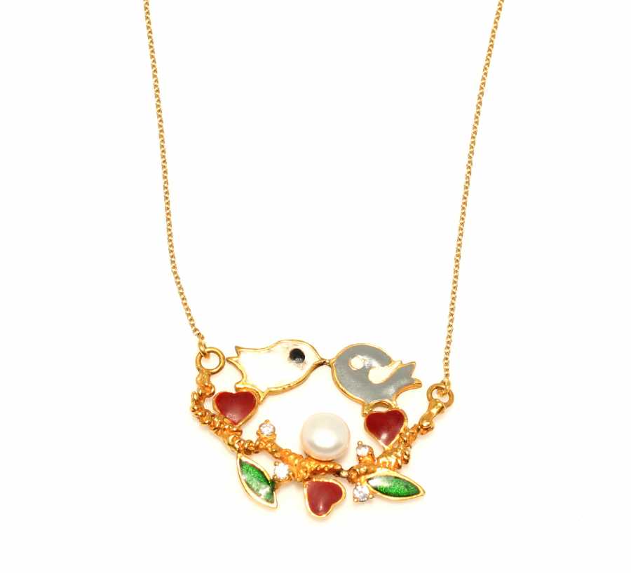 Altın kolye 22 ayar altından üretilmiştir. Çift kuşlu model kolye 3,8 cm'ye 2,7 cm boyutlarındadır. Altın kolye 52 cm uzunluğundadır. Kolye inci ve signyt zirkon taşlıdır. Bir dalın üzerinde iki kuşun muhabbeti kolyedir. Ağırlığı 16,64 gramdır. Verilen gramlar yaklaşıktır, değişebilir.
