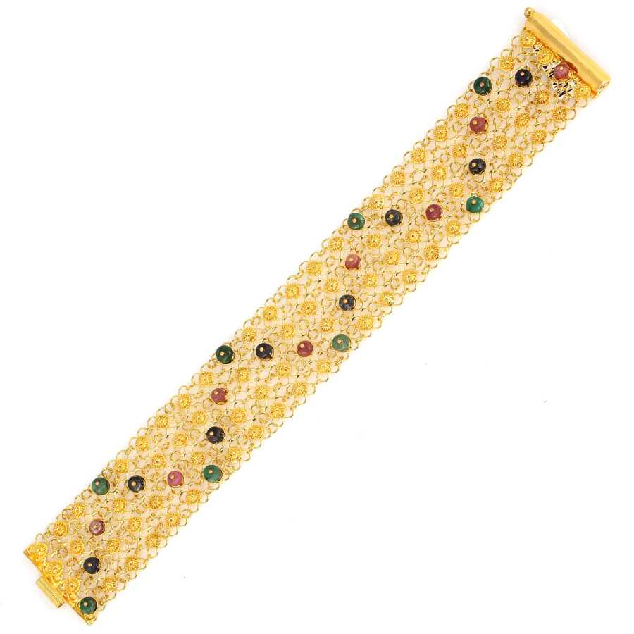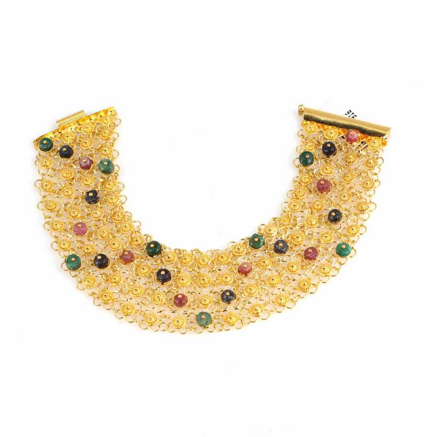Bileklik 22 ayar altından imal edilmiştir. Bileklik 19 cm uzunluğundadır. Bileklik yakut, zümrüt ve safir taşlıdır. Bileklik 2,9 cm kalınlığındadır. Bileklik 4 sıralıdır.