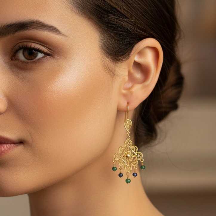 22 Ayar Altın Dörtgen Şeklinde Kök Taşlı Sallantılı Telkari Küpe