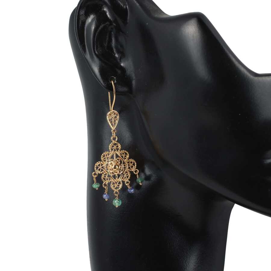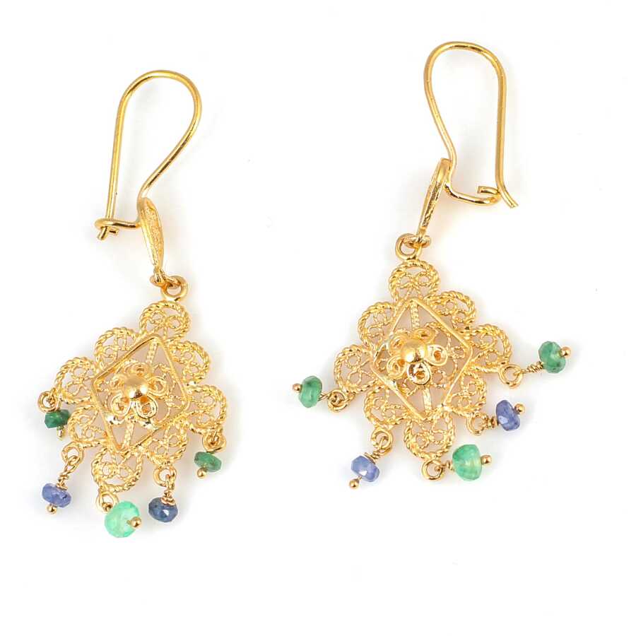 Altın küpe 22 ayar altından üretilmiştir. Dörtgen şeklindeki telkari küpe 2,2 cm eninde ve 5,5 cm boyutlarındadır. Telkari küpe safir, zümrüt taşlıdır. Altın küpe 8,82 gramdır.