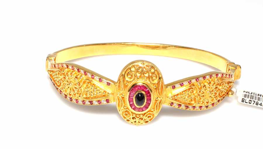 Bilezik 14 ayar altından imal edilmiştir. Antik model bilezik 6,2 cm çapındadır. Bilezik 2,2 cm enindedir. Bilezik safir, yakut ve signty zirkon taşlıdır. Bilezik 26,9 gram ağırlığındadır.
