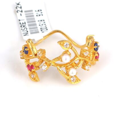 Notify me when its in stock Yüzük 22 ayar altından üretilmiştir. Sarmaşık model yüzük 23 ölçüdür. Tüm ölçüler yapılabilmektedir. Yüzüğün üst kısmı 1,5 cm boyutlarındadır. Yüzük inci ve kırmızı ve mavi zirkon taşlıdır. Ağırlığı 5,41 gramdır.