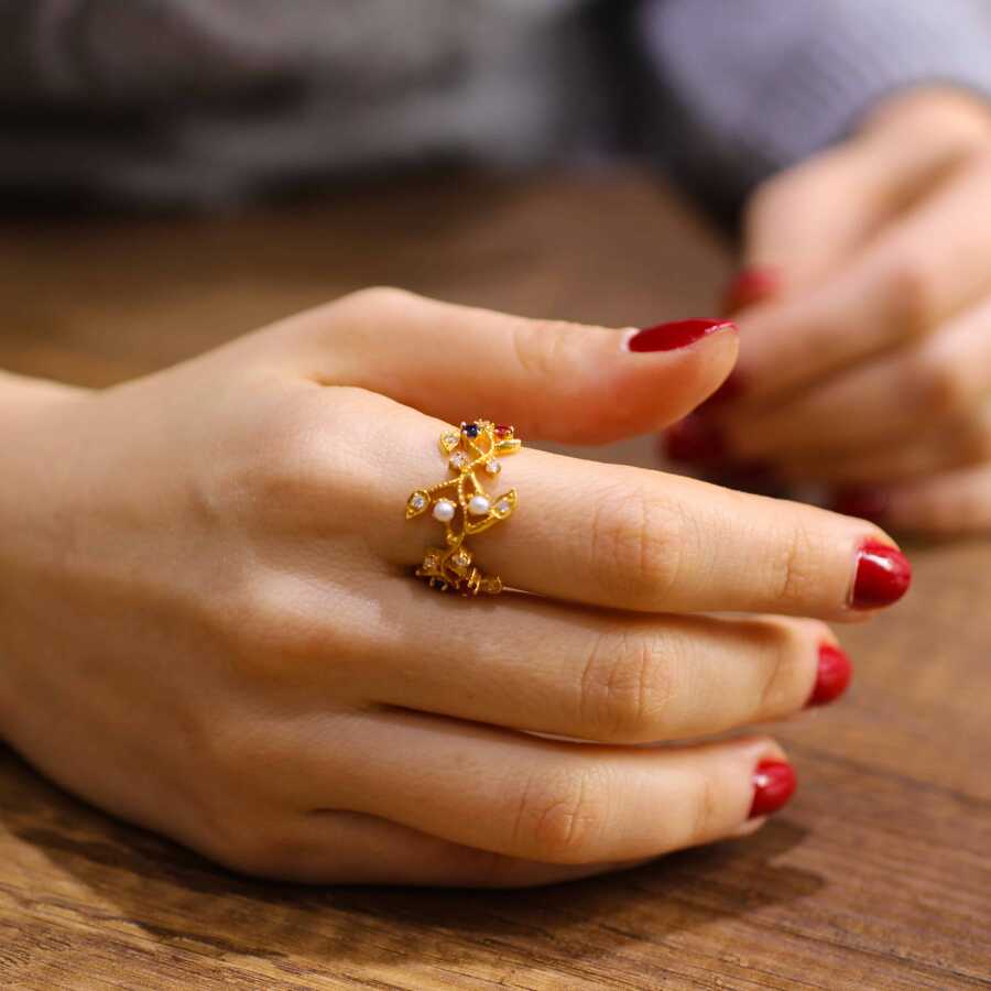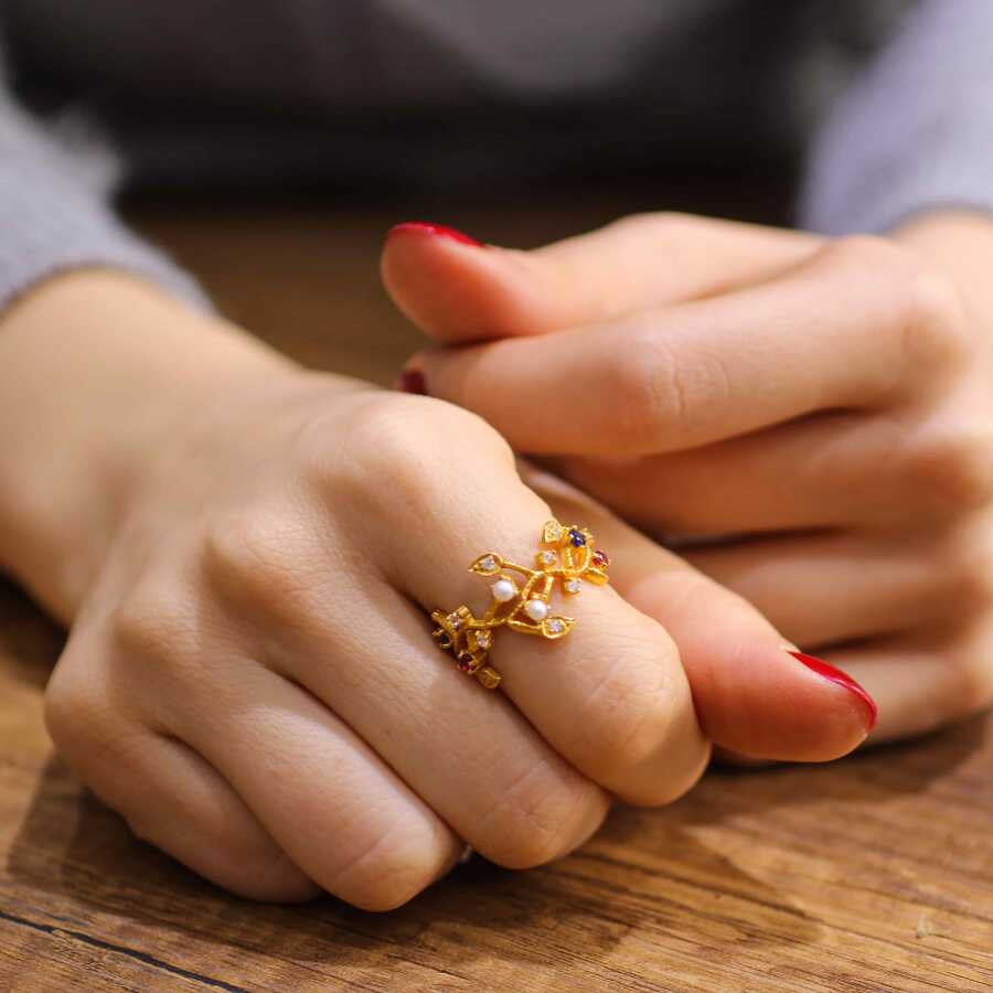 22 Ayar Altın Elişi Renkli Taşlı Dallı Yüzük