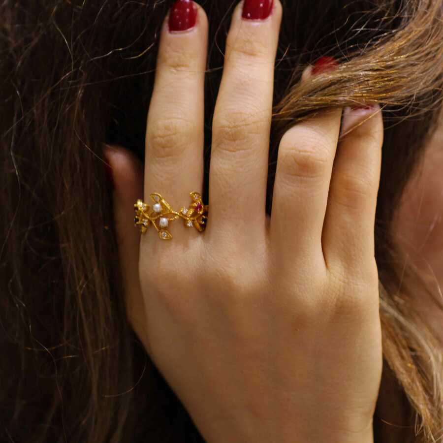 Yüzük 22 ayar altından üretilmiştir. Sarmaşık model yüzük 23 ölçüdür. Tüm ölçüler yapılabilmektedir. Yüzüğün üst kısmı 1,5 cm boyutlarındadır. Yüzük inci ve kırmızı ve mavi zirkon taşlıdır. Ağırlığı 5,41 gramdır.