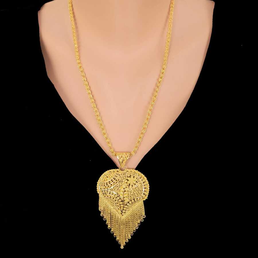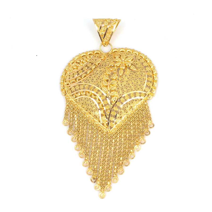 Kolye ucu 22 ayar altındır. Zincir dahil değildir. Hint işi kalp kolye ucunun uzunluğu 8,5 cm ve genişliği ise 4,5 cm boyutlarındadır. Kolye ucu el işi olduğu için desen değişiklik gösterebilir. El işi kolye ucu taşsızdır.